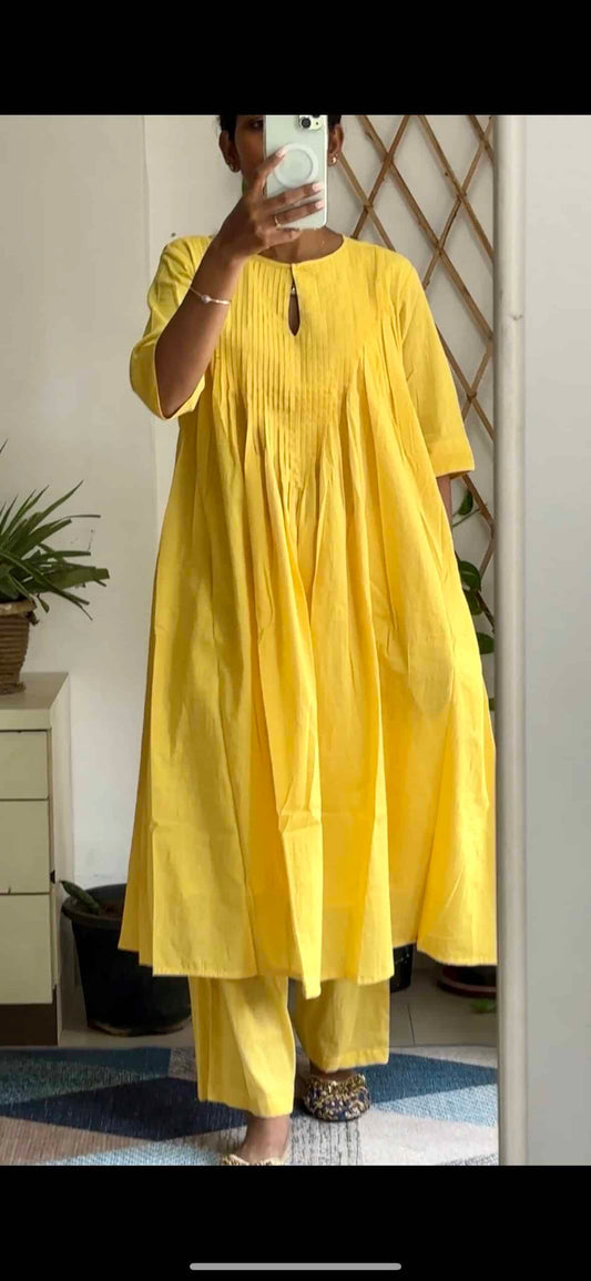 Pastel yellow Mul Pleated kurta Set