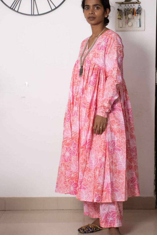 Pink Printed Chudi Sleeves Mul Gathered Kurta set
