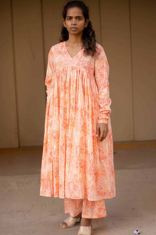 Orange Printed Chudi Sleeves Mul Gathered Kurta set