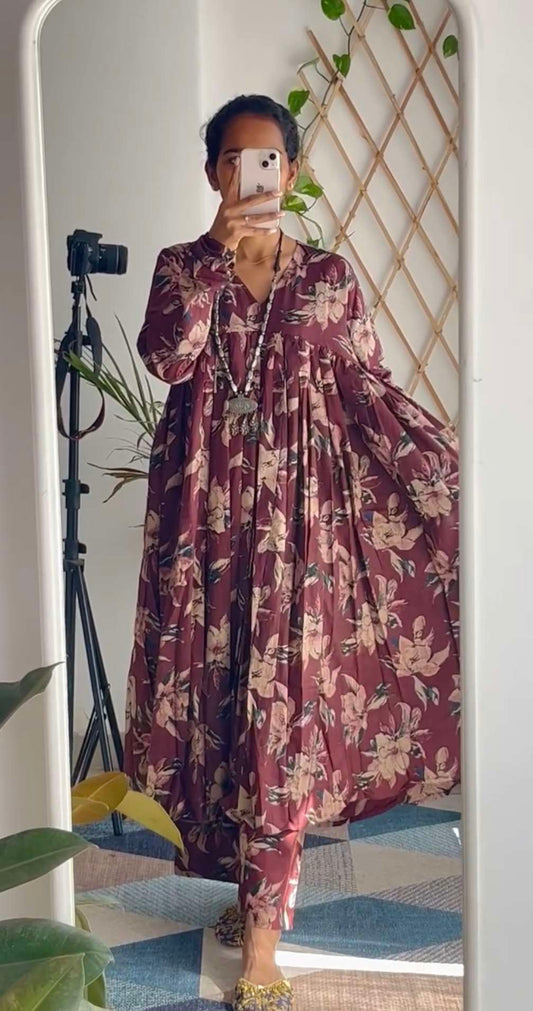 Wine Printed Chudi Sleeves Mul Gathered Kurta set