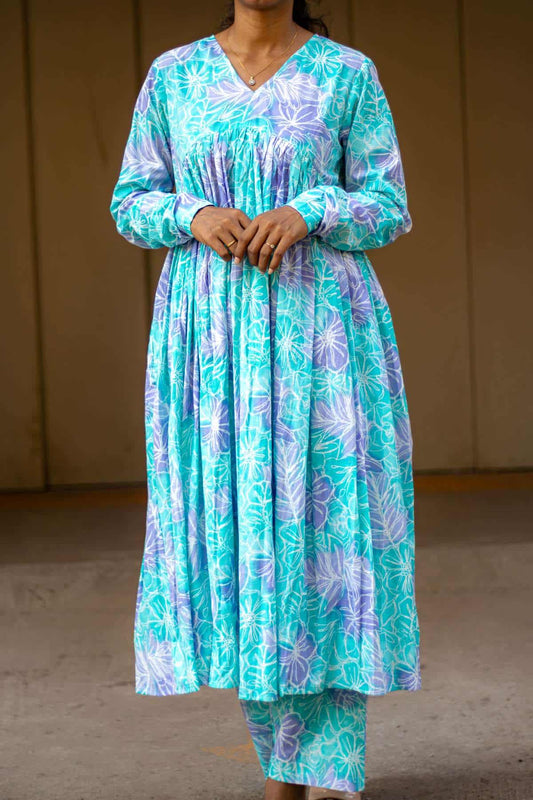 Sky Blue Printed Chudi Sleeves Mul Gathered Kurta set