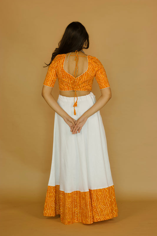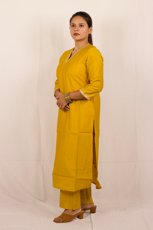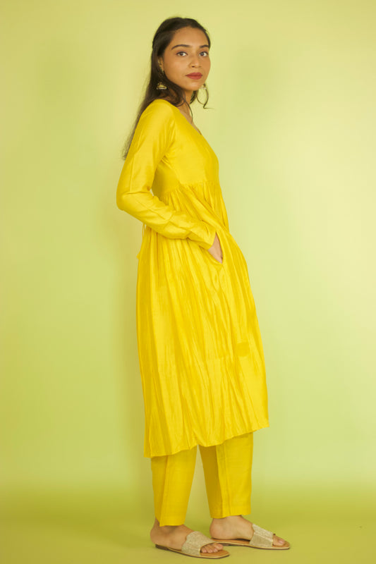 Yellow Chanderi Round Neck Gathered Kurti Set