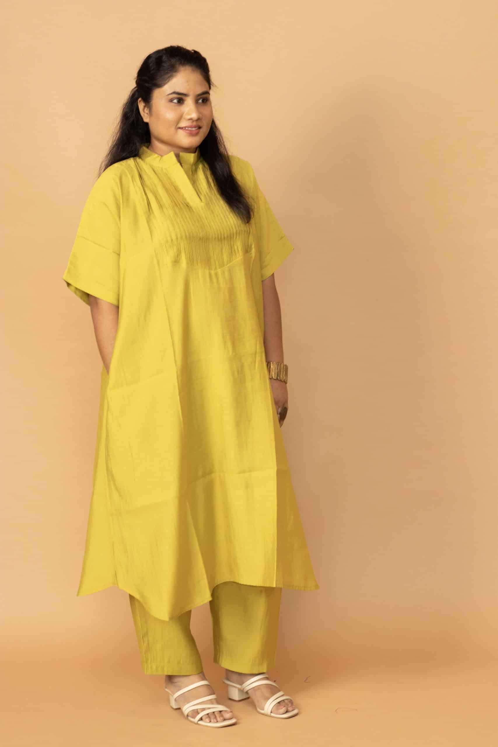 The Chanderi Blend Pleated Kurta Set is a sophisticated and versatile outfit, perfect for any occasion. Its subtle shine and elegant pleats offer a classy look, while the roundish side slit and pockets add a modern touch. The set is designed to be size-friendly, flattering all body shapes, and comes with matching bottoms featuring a half-elasticated waistband for added comfort. This kurta set seamlessly combines style and ease, making it a must-have for your wardrobe.